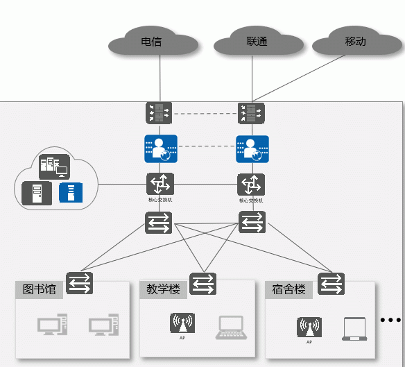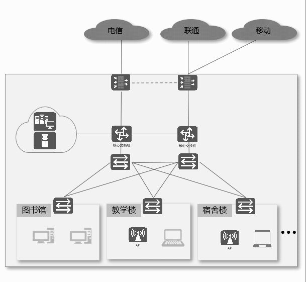 XXXX中學(xué)經(jīng)過多年對校園網(wǎng)的建設(shè)和積累,已成功搭建了高質(zhì)量的校園網(wǎng)絡(luò)基礎(chǔ)平臺,目前學(xué)校師生、教職工約2000多人,學(xué)校網(wǎng)絡(luò)的主要組成部分有圖書館、教學(xué)樓、宿舍樓等區(qū)域網(wǎng)絡(luò),主要在校學(xué)生的教學(xué)、學(xué)生住宿等功能。學(xué)校通過三條運(yùn)營商網(wǎng)絡(luò)連接Internet,其中聯(lián)通100M,電信300M,移動500M,其中DMZ區(qū)有需要向外發(fā)布的WEB服務(wù)器,教務(wù)系統(tǒng)相關(guān)資源以及圖書館區(qū)的電子閱覽資源等。網(wǎng)絡(luò)拓?fù)鋱D如下:
