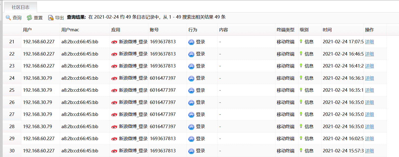 可記錄發(fā)貼用戶的源地址、目的地址、發(fā)貼網(wǎng)站、發(fā)貼時間和具體發(fā)貼內(nèi)容,網(wǎng)頁發(fā)帖支持對特定時間、特定關(guān)鍵字的查詢功能。通過管理員賬戶登錄后,可以查看到網(wǎng)頁發(fā)貼的具體內(nèi)容,如下圖所示: