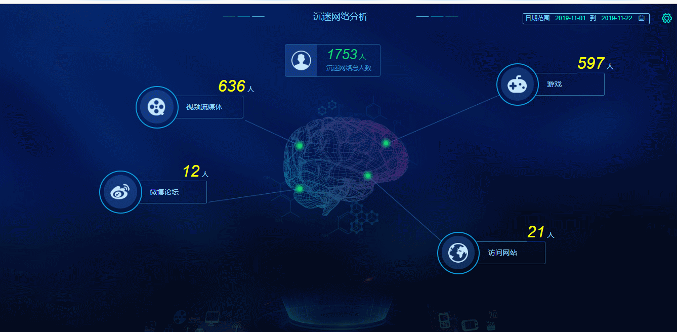 通過用戶畫像,追溯學(xué)生上網(wǎng)軌跡,建立上網(wǎng)模型,整個過程中通過分析給不同學(xué)生打上不同的標(biāo)簽進(jìn)行區(qū)分,完成對學(xué)生進(jìn)行用戶畫像,對是否沉迷于網(wǎng)絡(luò)、瀏覽色情網(wǎng)站、發(fā)布非法言論的學(xué)生進(jìn)行初步篩查,讓班主任、心里輔導(dǎo)老師對學(xué)生的心理輔導(dǎo)做到有的放矢。