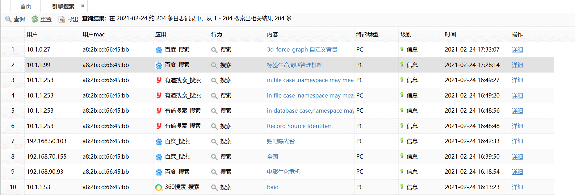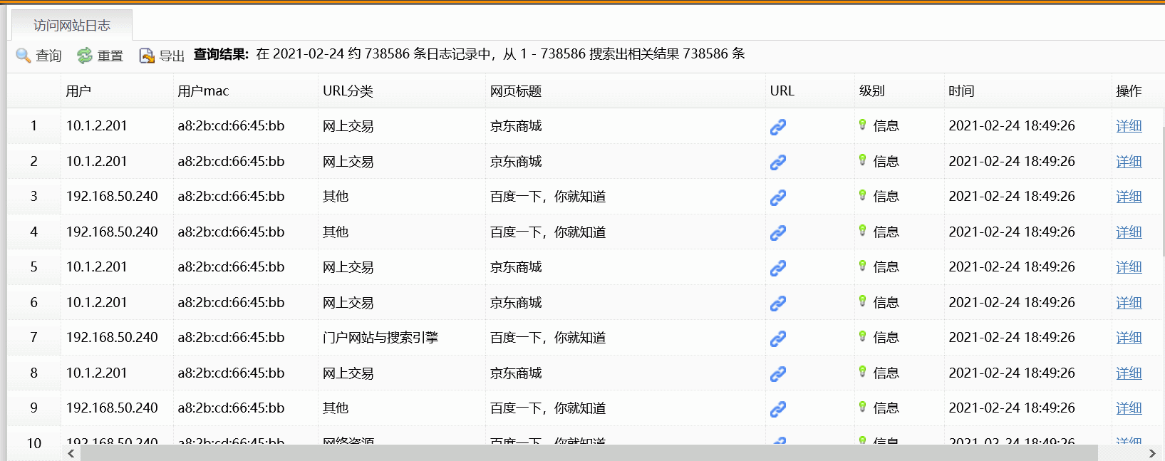 AZ6000可記錄瀏覽網(wǎng)站用戶IP地址,網(wǎng)站主題、URL地址及其子鏈接,瀏覽網(wǎng)站時(shí)間。如下圖所示: