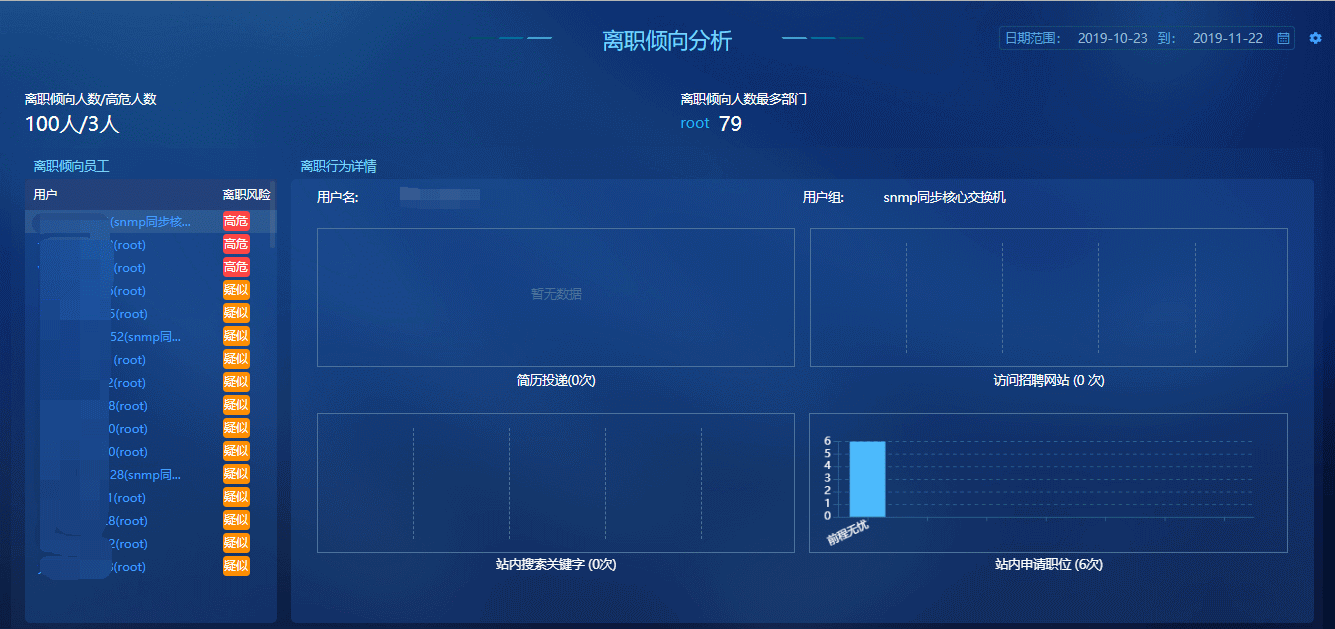 ? AZ6000結(jié)合BA虛擬化軟件,對員工上網(wǎng)數(shù)據(jù)進(jìn)行深度挖掘,通過對員工上網(wǎng)行為審計(jì)日志的分析,及時(shí)發(fā)現(xiàn)具有“離職傾向”的員工,當(dāng)出現(xiàn)員工離職風(fēng)險(xiǎn)時(shí),及時(shí)提醒涉及用戶、涉及應(yīng)用、目標(biāo)公司等內(nèi)容,提升HR業(yè)務(wù)延續(xù)性,避免公司人才損失,解決了HR對于離職員工無法掌握動(dòng)態(tài),不能及時(shí)有效制定策略,導(dǎo)致人力資源出現(xiàn)隱患。另外可對員工上網(wǎng)時(shí)間和訪問內(nèi)容進(jìn)行檢測,從而可分析出員工工作飽和度,員工工作狀態(tài),從而為優(yōu)化公司管理策略提供輔助依據(jù)。