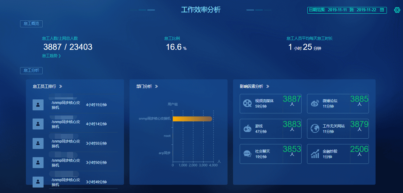 l 可實(shí)現(xiàn)對員工上網(wǎng)行為數(shù)據(jù)進(jìn)行深度挖掘,就其上網(wǎng)行為進(jìn)行用戶畫像,可做工作效率分析、離職傾向分析等,如掌握公司員工動(dòng)態(tài),針對HR有助于對員工離職信息做分析,反饋給公司管理層,做制度調(diào)優(yōu)等,另外很對公司管理層,還可通過員工工作效率分析,適當(dāng)調(diào)整工作量等,讓管理更合理。
