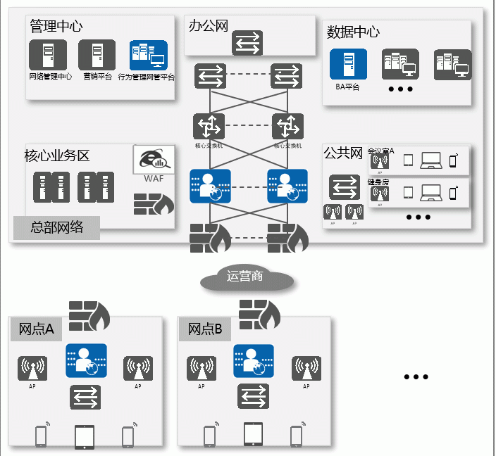 總部集中網(wǎng)管部署:總部網(wǎng)絡(luò)中以主-備模式的HA透明接入兩臺高性能的AZ6000設(shè)備,安裝安州集中網(wǎng)管平臺“AZ Manager”和行為分析感知平臺“BA”,實現(xiàn)對總部和各分支網(wǎng)點設(shè)備的統(tǒng)一管理、數(shù)據(jù)的深度挖局,完成用戶畫像,體現(xiàn)數(shù)據(jù)價值。